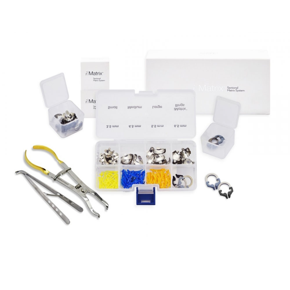 • PM-01, iMatrix™ Starter Kit, 1 x black standard ring, 1 x grey narrow ring, 1 x forceps, 1 x pin tweezers, 35 x yellow small wedges, 35 x blue medium wedges, 35 x range large wedges, 35 x 3.5 mm, 35 x 4.5 mm, 35 x 5.5 mm, 35 x 6.5 mm matrices